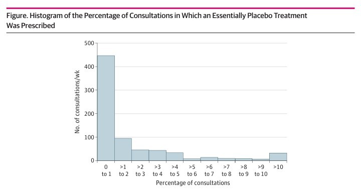 この研究では、818人のGPの回答を調査し、回答者の84%がキャリアの中で少なくとも一度は実質的なプラセボ治療を処方したことが分かった。平均して、プラセボ処方は2週間に1回、または150回の診察に1回発生した。処方率は国によって0.1%から2.5%まで異なった。プラセボ治療は、男性、経験年数が長い人、または週あたりの労働時間が少ない人によってより頻繁に与えられていたが、これらの違いはすべて小さなものだった 。