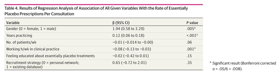 主要評価項目は、推定週間処方数に標準化された実質的なプラセボ処方であり、この数値を週あたりの診察患者数で割って、診察における実質的なプラセボ処方の割合を計算した。個々の特性との関連を調べるために、多変量線形回帰分析に、性別、年齢、教育の認識された質、経験年数、患者数、労働時間、および募集方法が要因として入力された。回帰分析には、すべての変数で有効なスコアを持つ669人の回答者のみが含まれた。ボンフェローニ補正が適用された。国間の統計的比較は、サンプルの小ささのために行われなかった。